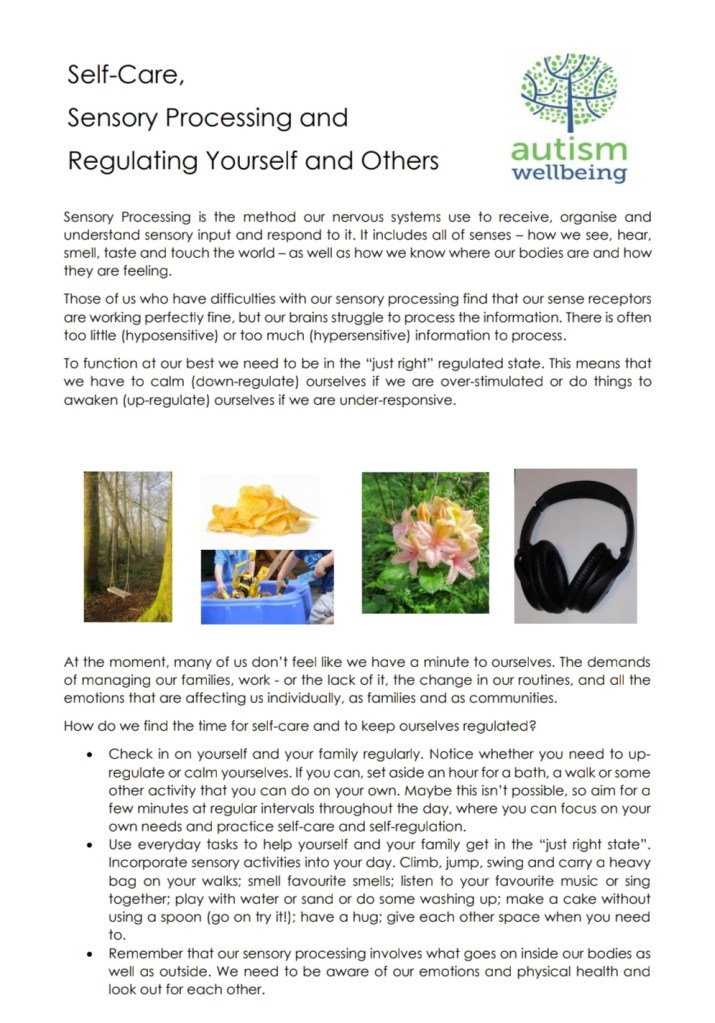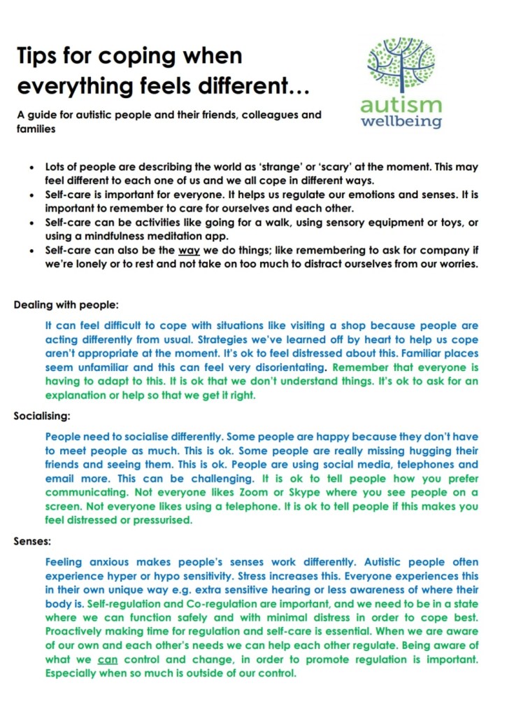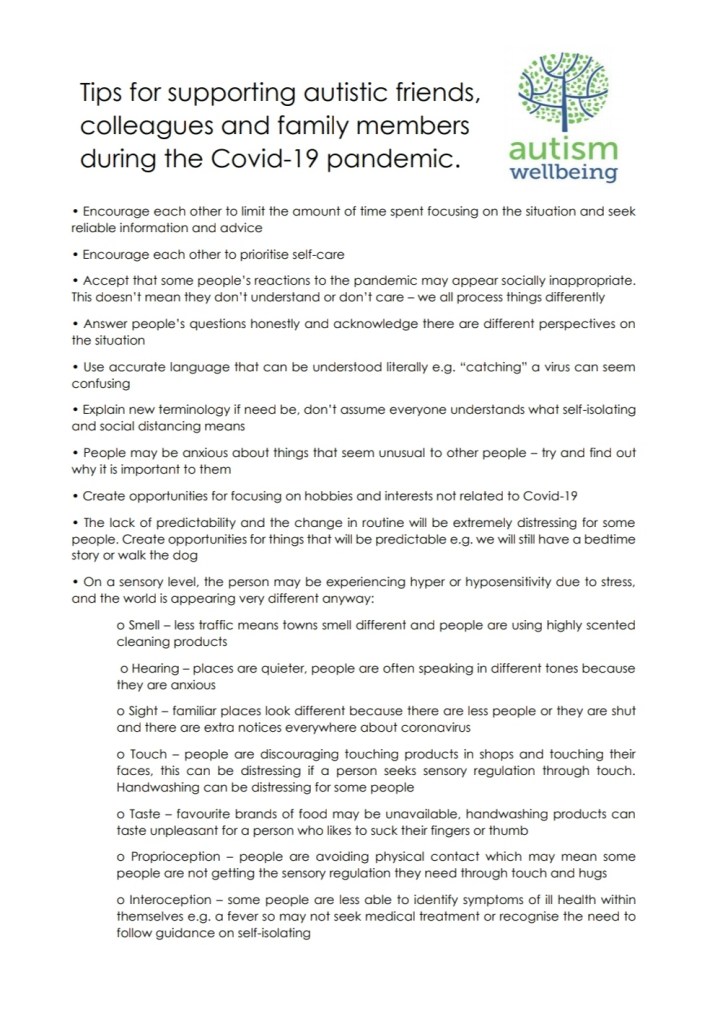 This was my first ever autism blog, I hope you liked it. I’ve continued to blog, please check out my other posts via the link or menu. Autism wellbeing have produced lots of tips and ideas for support during lockdown that are on our Facebook page. They are produced by a team of autistic and non-autistic professionals and parents.